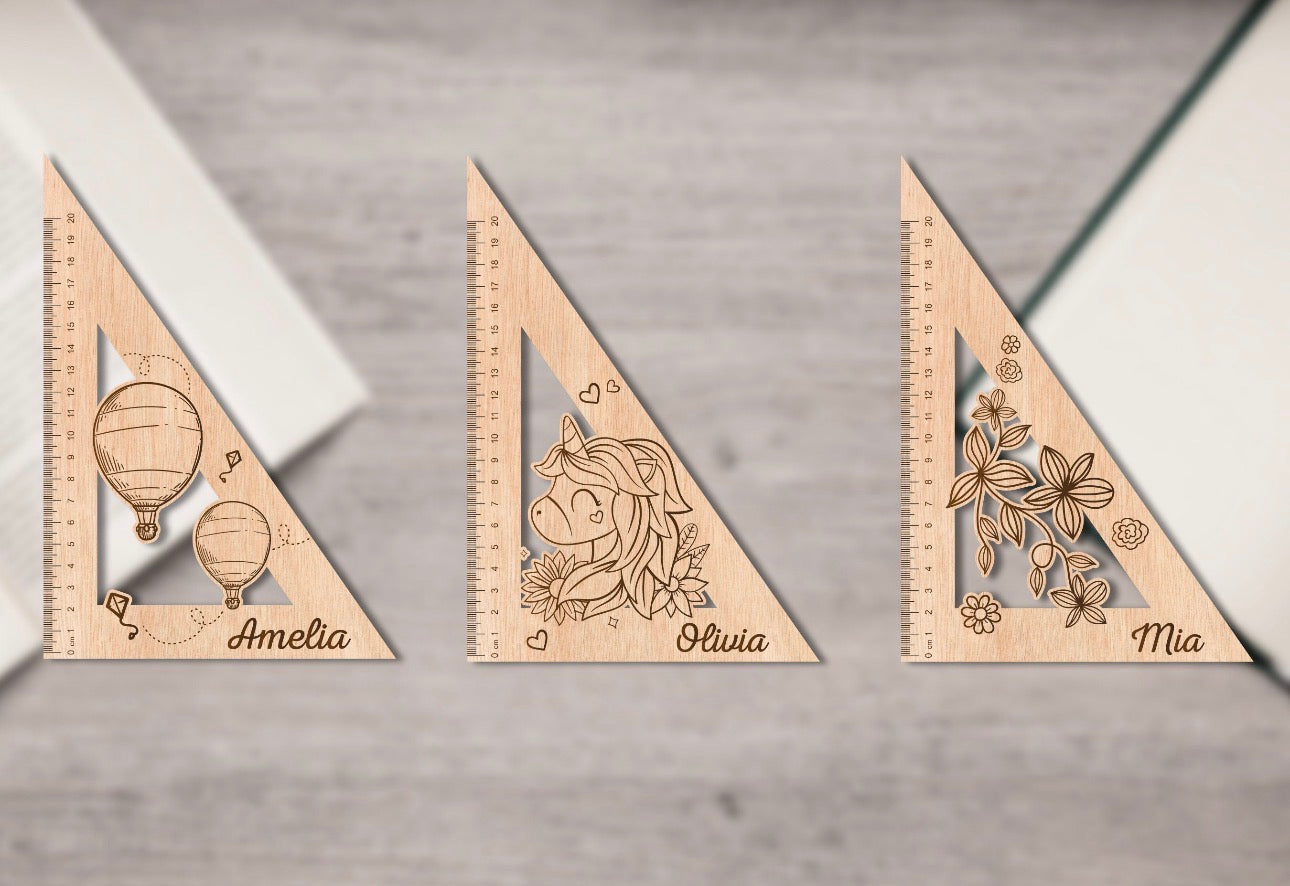 Make learning extra special with this personalized wooden triangle ruler, laser engraved with your child’s name and a beautiful design. Perfect for school, homework, or as a unique gift.